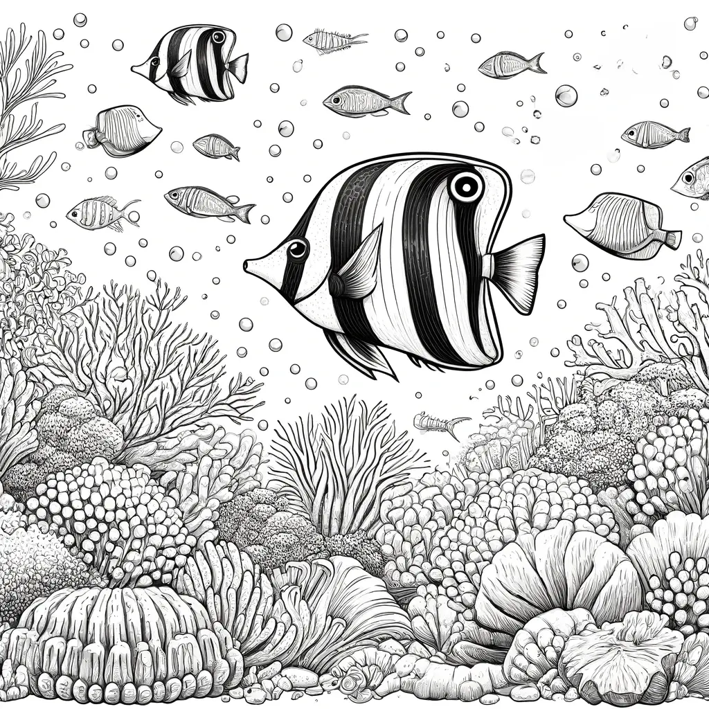 Colorea estos peces tropicales nadando alrededor de un coral. Un dibujo detallado y relajante, ideal para todas las edades.