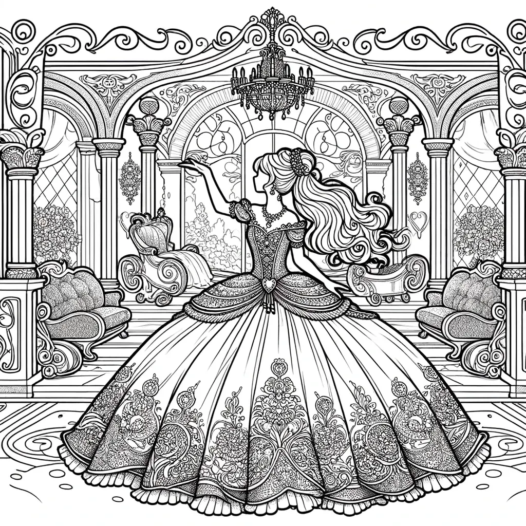 Disfruta coloreando este detallado dibujo de una princesa en un baile real. Perfecto para los amantes de los detalles.