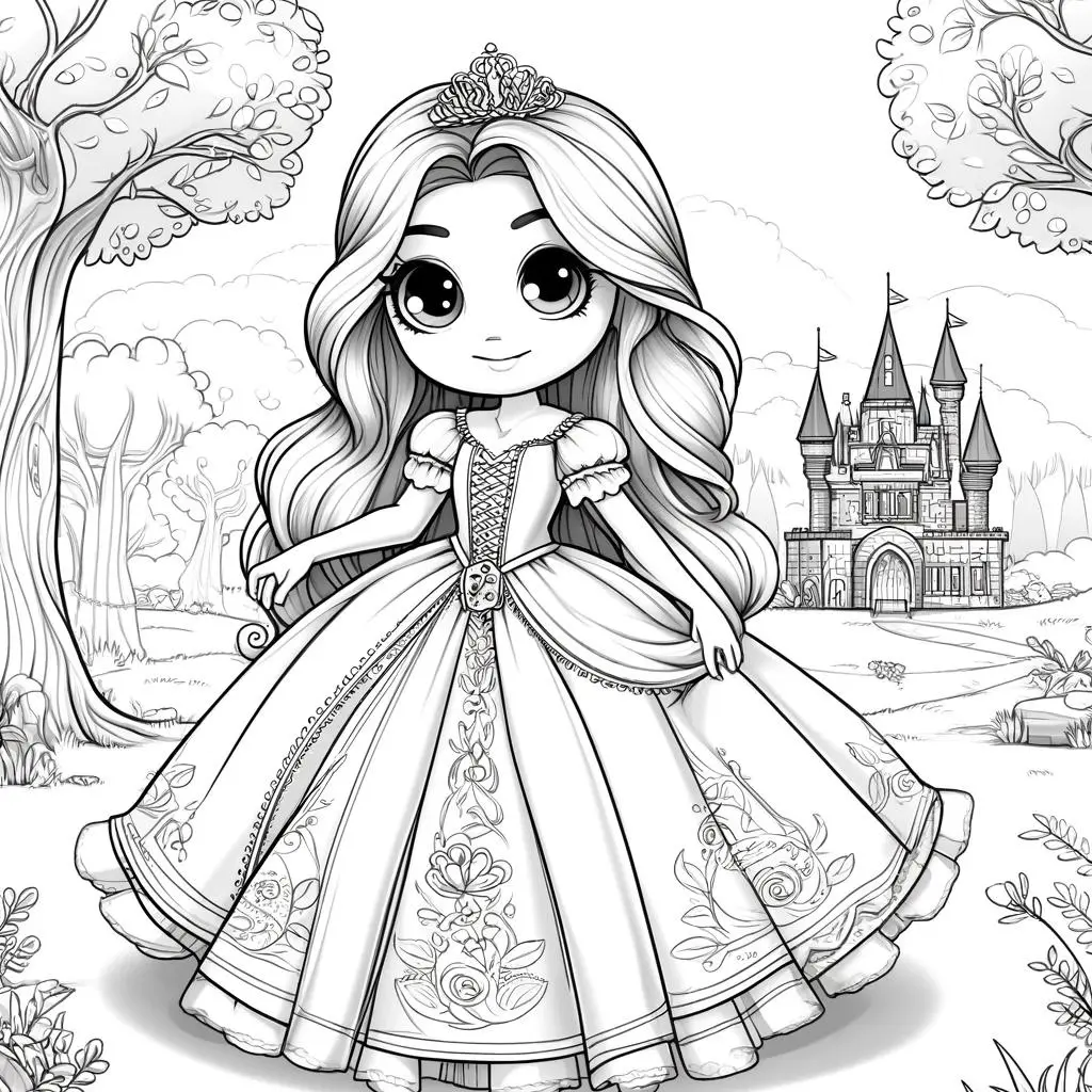 Disfruta coloreando este hermoso dibujo de una princesa en un bosque encantado con su castillo. Ideal para los pequeños artistas.