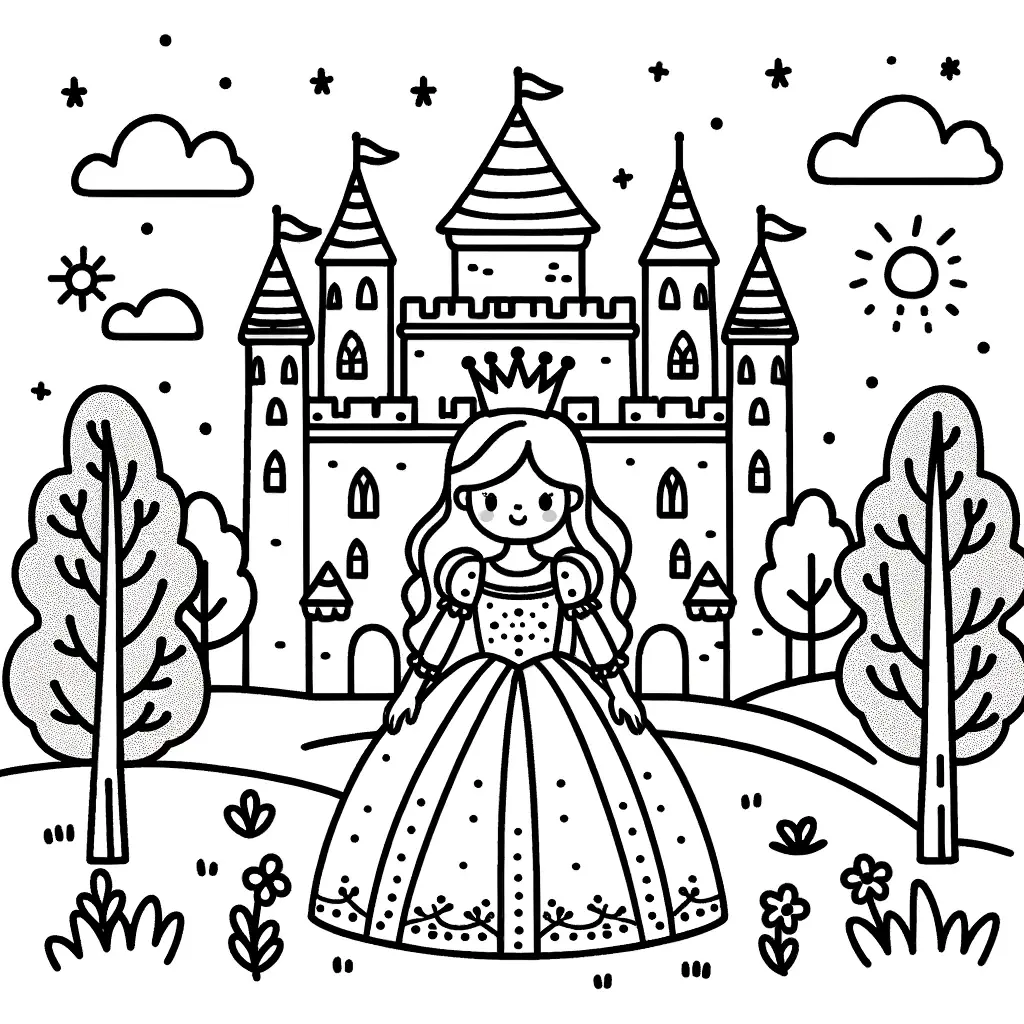 Disfruta coloreando este hermoso dibujo de una princesa en su castillo. Perfecto para los pequeños artistas.