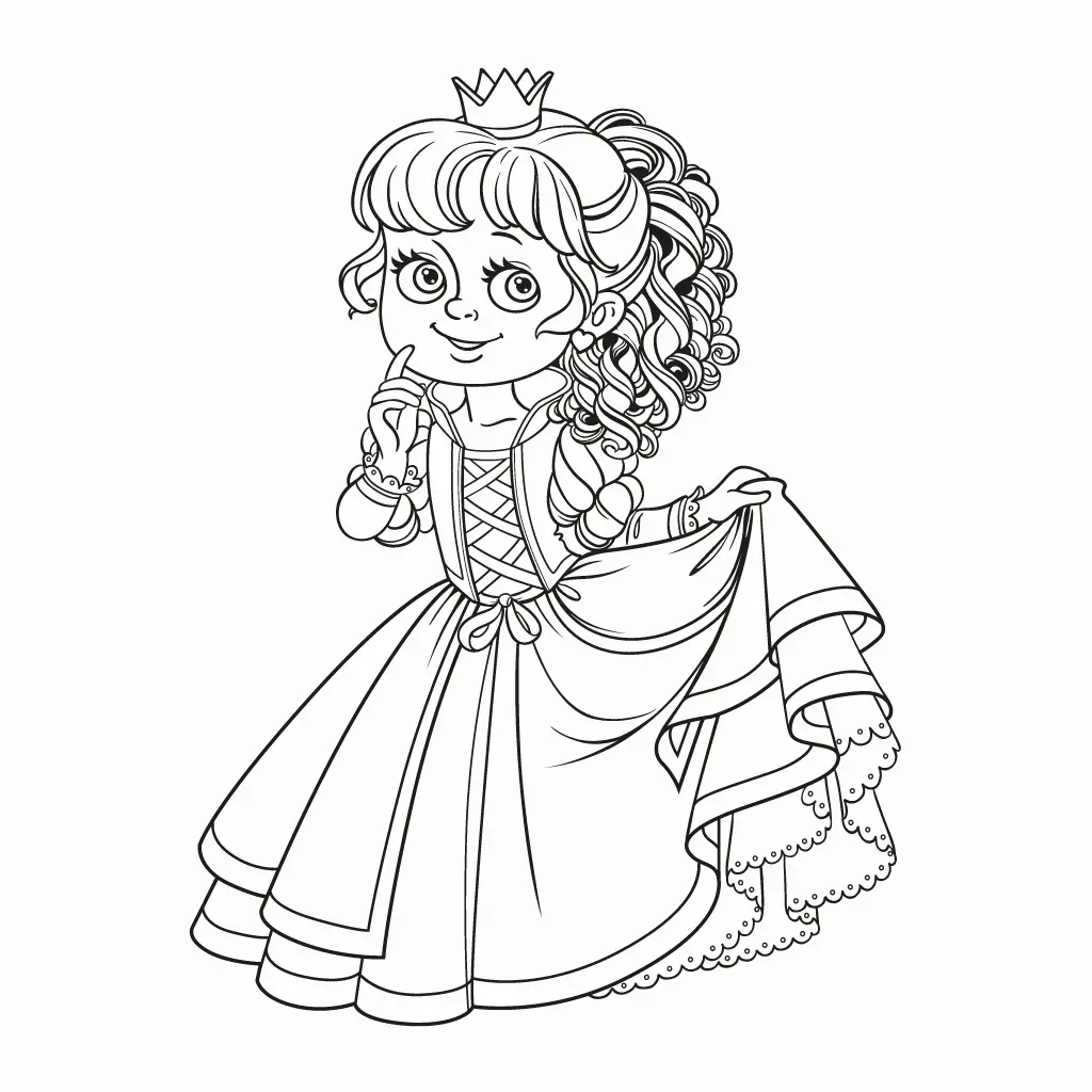 Colorea a esta amable princesa con una sonrisa encantadora. Ideal para los niños pequeños.