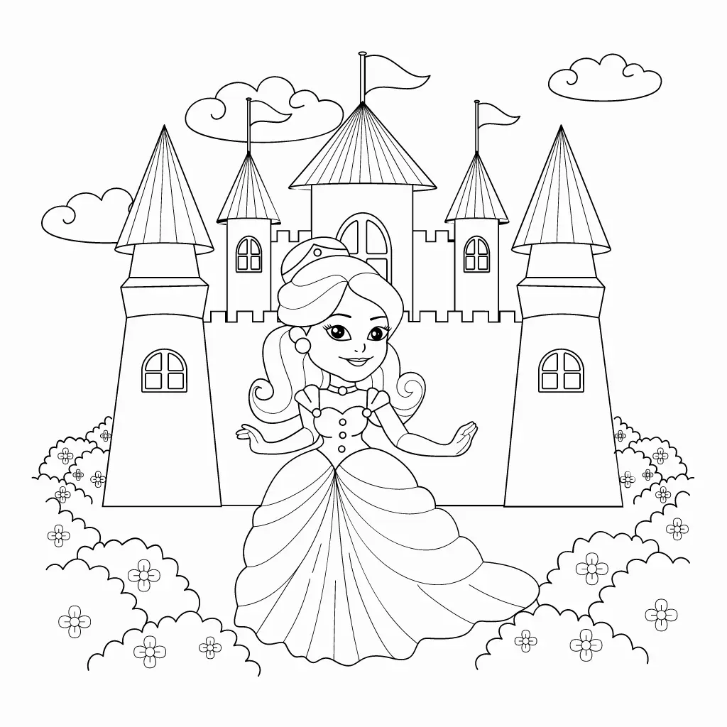 Colorea esta serena princesa frente a su castillo mágico. Perfecto para imprimir y disfrutar.