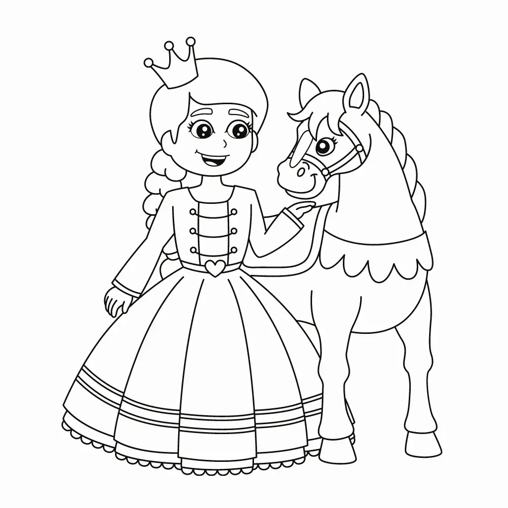 Colorea a esta princesa sonriente con su amigo caballo. Ideal para los más pequeños.