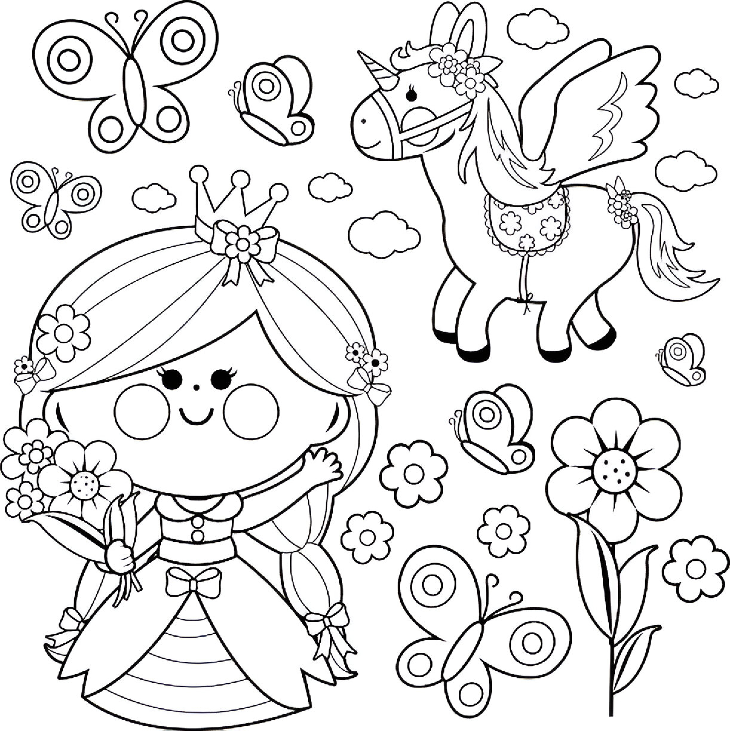 Entra en un mundo mágico con esta encantadora princesa y su unicornio, rodeados de mariposas. Ideal para niños y niñas que disfrutan de los cuentos de hadas y los personajes kawaii. Con un diseño fácil de colorear, este dibujo te transportará a un reino lleno de magia y fantasía, donde la princesa y su fiel unicornio se embarcan en dulces aventuras.