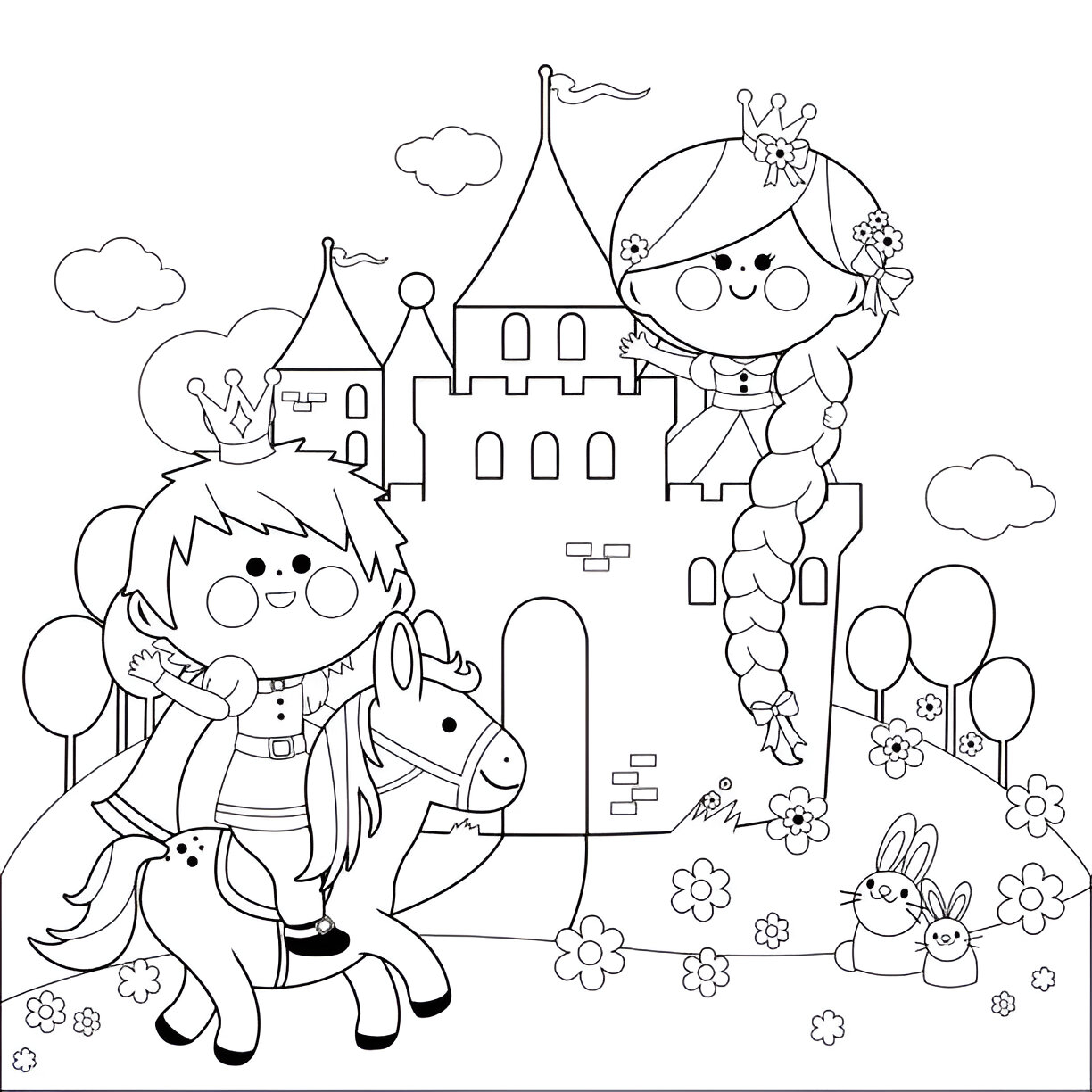 Revive la mágica historia de Rapunzel con este hermoso dibujo para colorear. Rapunzel observa desde su castillo mientras el príncipe se acerca montado a caballo. Los niños y niñas pueden dar vida a esta escena llena de ternura y aventura, con el estilo kawaii que tanto les gusta. Una imagen perfecta para colorear y crear su propio final feliz para este clásico cuento de hadas.