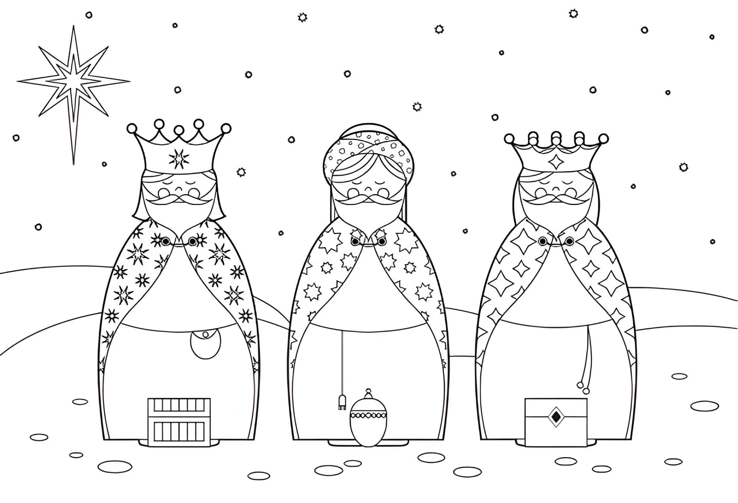 Este dibujo de los Reyes Magos bajo un cielo estrellado es perfecto para colorear y celebrar la historia de la Epifanía. Es ideal para que los niños aprendan sobre esta parte de la tradición navideña mientras se divierten creando una escena llena de magia y estrellas.