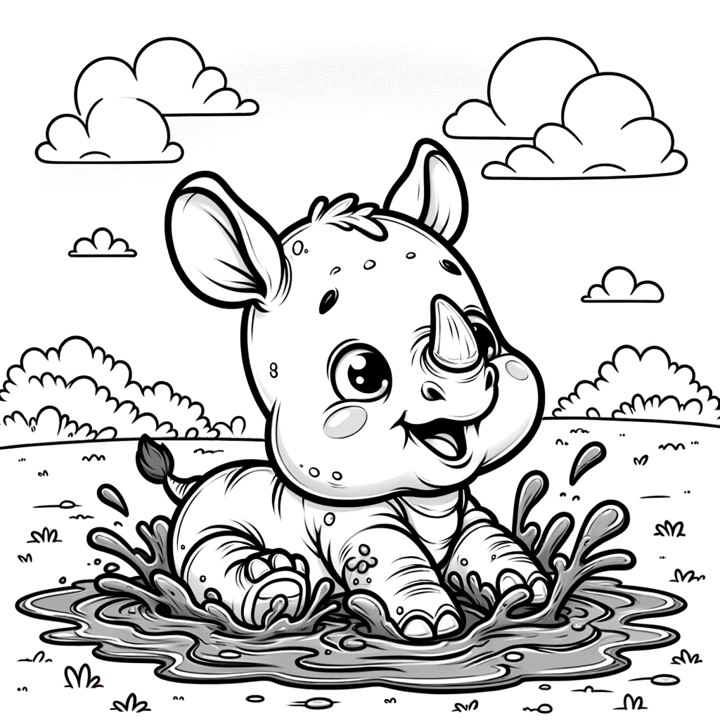 Colorea este adorable rinoceronte bebé jugando en el barro. Un dibujo divertido y perfecto para que los niños se entretengan.