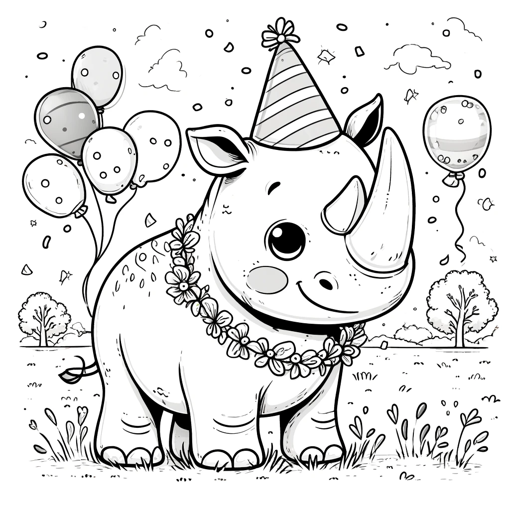 Celebra coloreando este rinoceronte decorado para una fiesta de cumpleaños. Un dibujo festivo y divertido para imprimir y disfrutar.