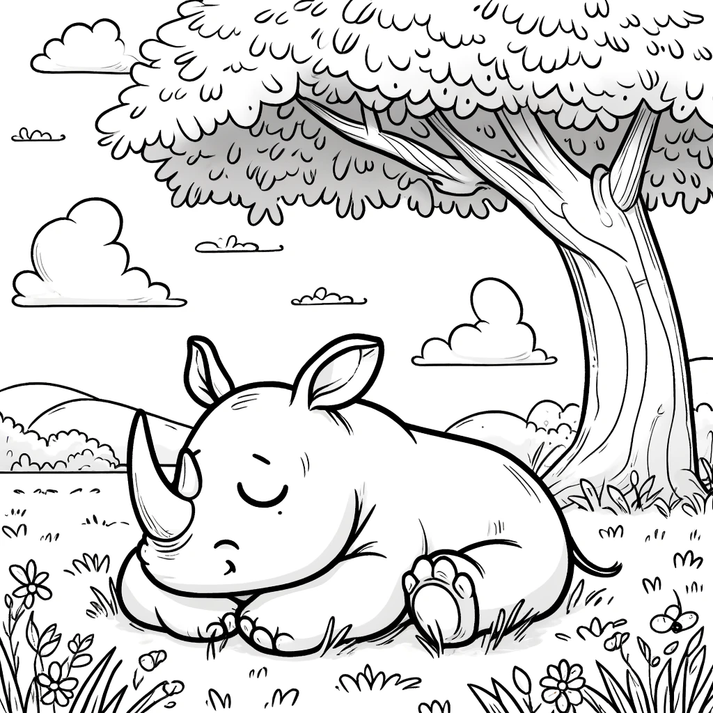 Relájate coloreando este rinoceronte durmiendo bajo un árbol. Un dibujo tranquilo y perfecto para imprimir y disfrutar.