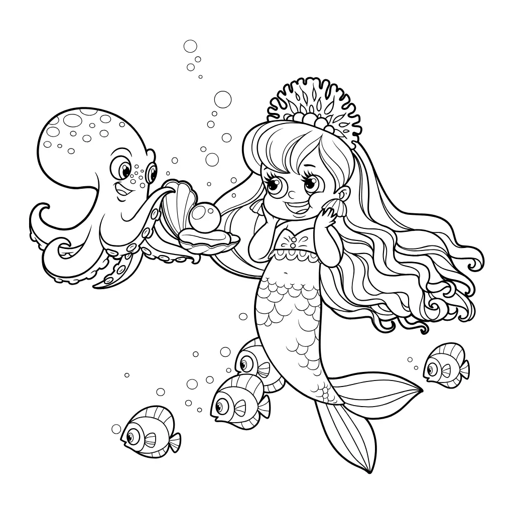 Disfruta coloreando este adorable dibujo de una sirena feliz con un pulpo y un regalo. Perfecto para los pequeños artistas.