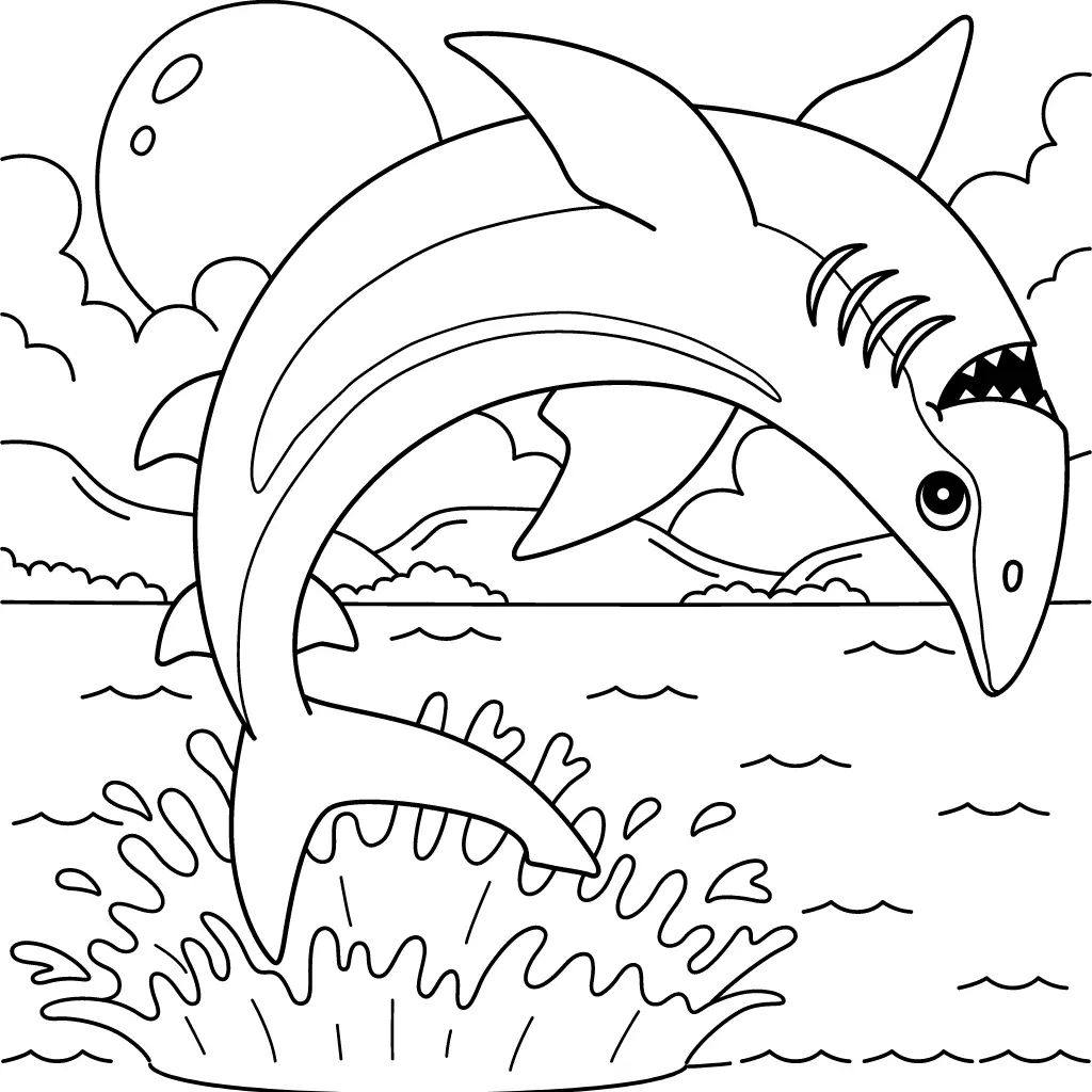 Descarga y colorea este tiburón saltando en el mar. Un dibujo fácil y relajante, ideal para todas las edades.
