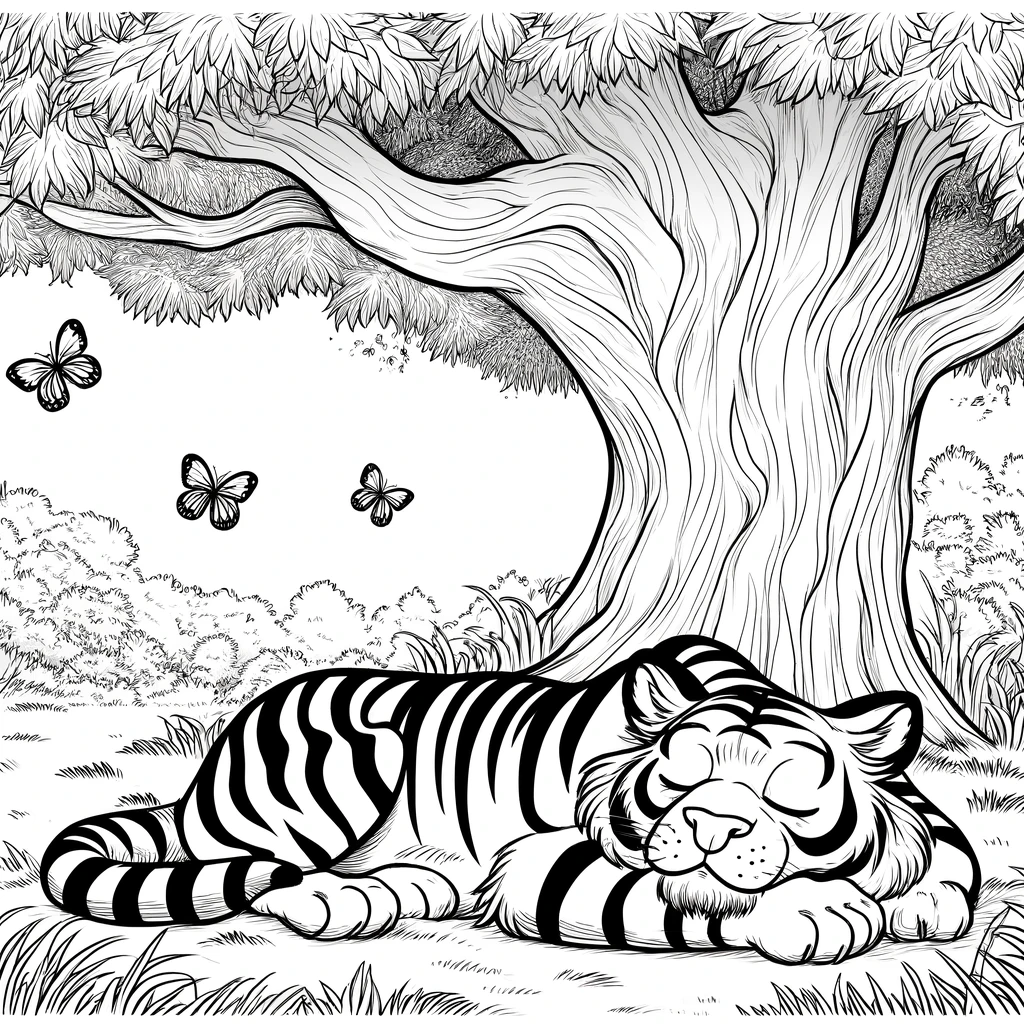 Relájate coloreando este dibujo de un tigre durmiendo plácidamente. Ideal para una actividad tranquila y relajante.