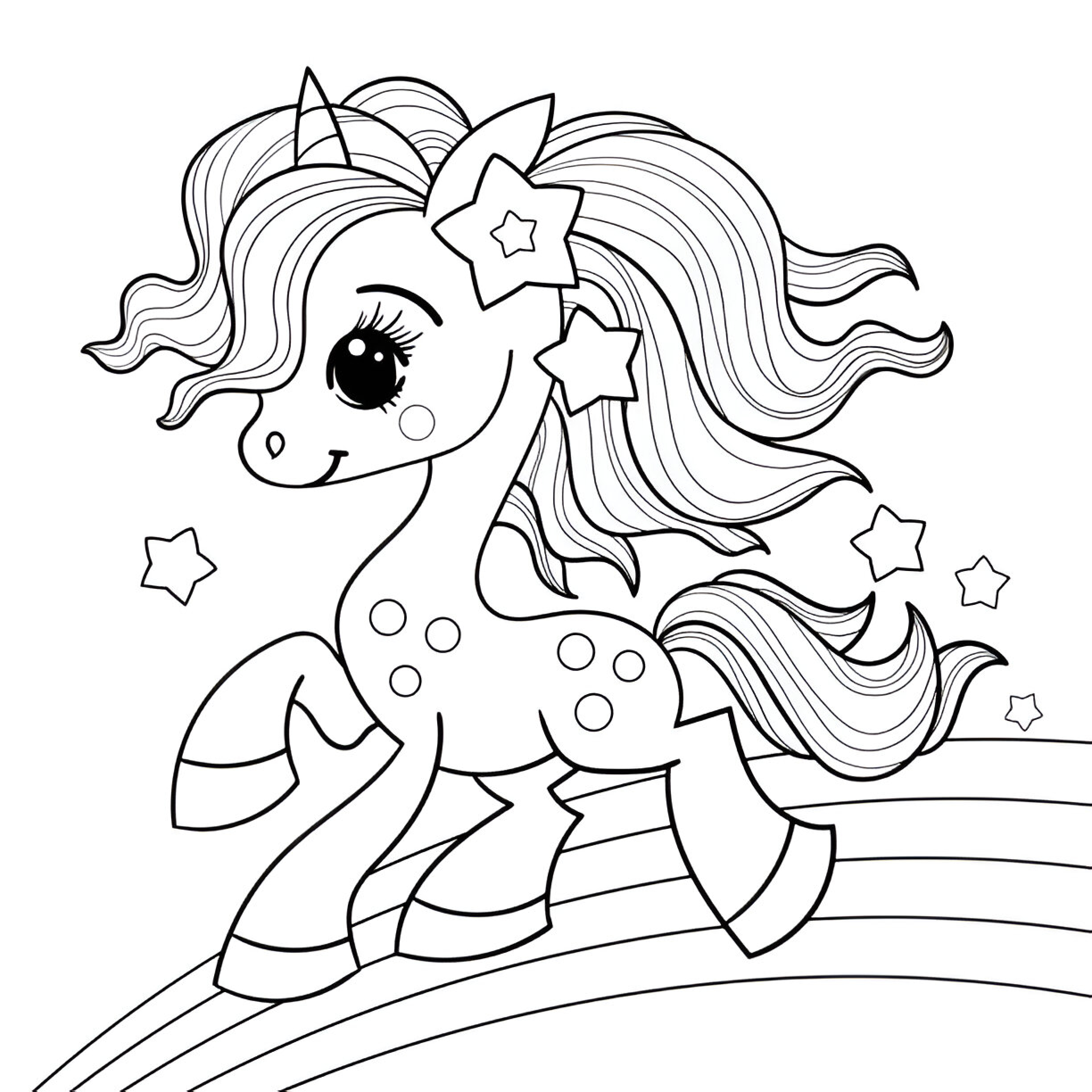 Un tierno unicornio kawaii surca los cielos rodeado de estrellas y arcoíris, en un diseño que encarna la magia y la dulzura. Ideal para niños pequeños que disfrutan de las figuras adorables y las escenas llenas de color y alegría. Este dibujo para colorear estimulará su creatividad y los transportará a un universo encantado.