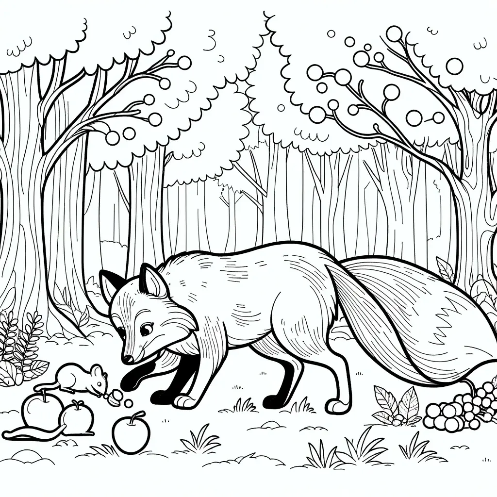 Disfruta pintando este dibujo de un zorro recolectando alimentos. Perfecto para los amantes de la naturaleza y la vida salvaje.